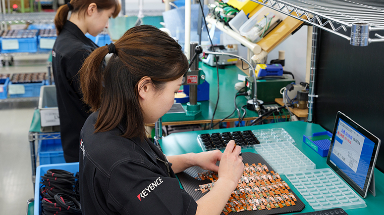 1985年の設立以来一貫して、キーエンス商品の「ものづくり」に携わっています。当部門では、製造現場で培ってきた製造ノウハウとオープンな社風の中、経験や年齢に関係なく、気づき・アイデアを活発に意見交換をしながら改善を繰り返し、さらなる品質向上や生産性の改善に努めています。